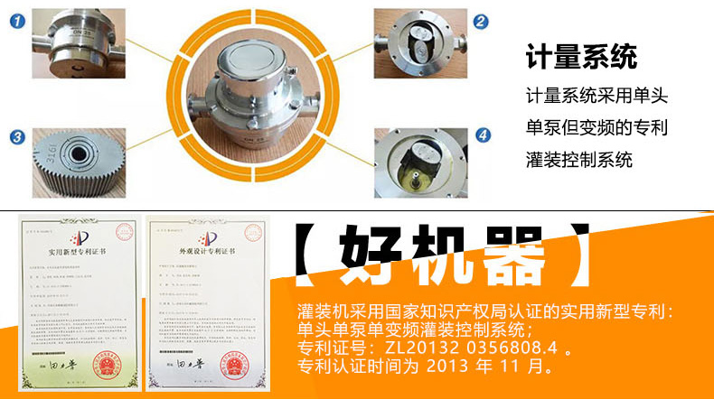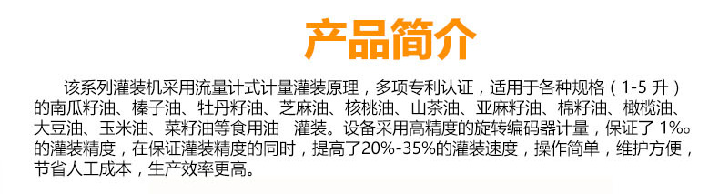 該系列灌裝機(jī)采用流量計(jì)式計(jì)量灌裝原理,多項(xiàng)認(rèn)證,適用于各種規(guī)格(1-5升)的南瓜籽油、榛子油、牡丹籽油、芝麻油、核桃油、山茶油、亞麻籽油、棉籽油、橄欖油、大豆油、玉米油、菜籽油等食用油灌裝。設(shè)備采用高精的旋轉(zhuǎn)編碼器計(jì)量,保證了1%o的灌裝精度,在保證灌裝精度的同時(shí),提高了20%-35%的灌裝速度,操作簡(jiǎn)單,維護(hù)方便,節(jié)省人工成本,生產(chǎn)效率更高。
