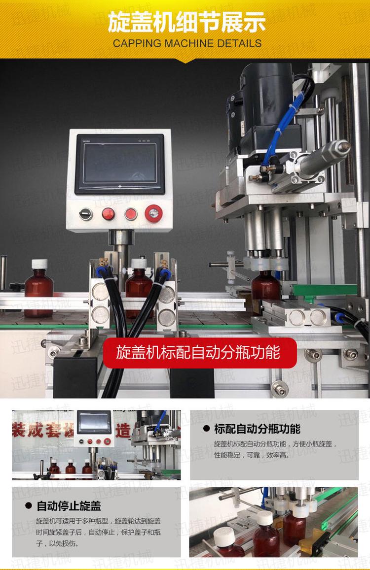4、塑料瓶消毒水灌裝機(jī)  小玻璃瓶溶液灌裝機(jī)的旋蓋機(jī)部分可適用于多種瓶型,旋蓋輪達(dá)到旋蓋時間旋緊蓋子后,自動停止,保護(hù)蓋子和瓶子,以免損傷。