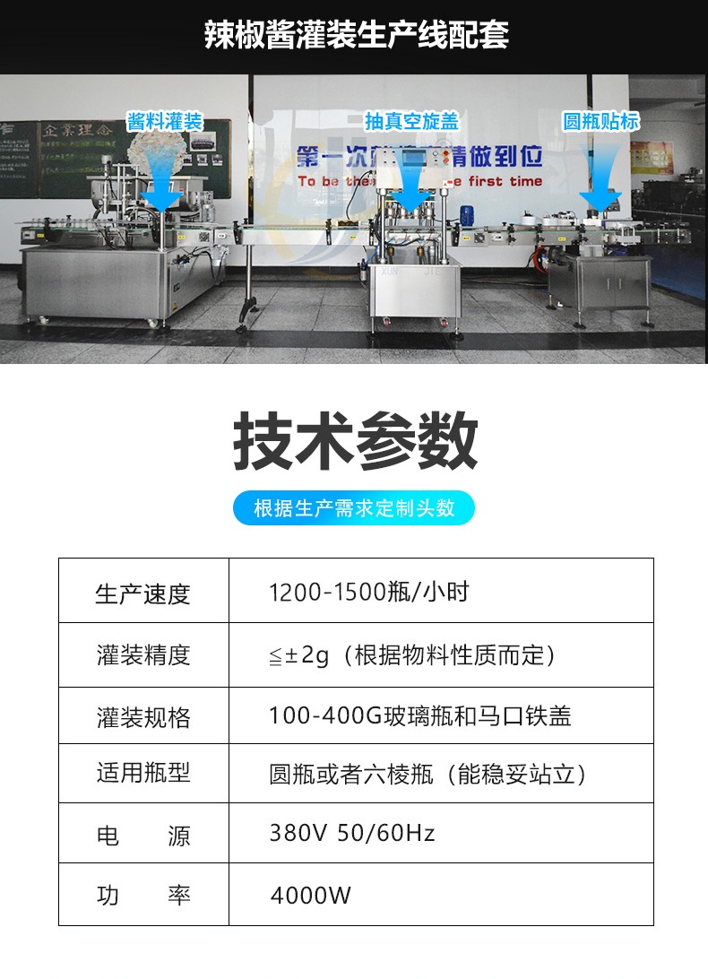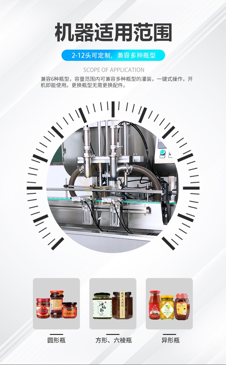 全自動(dòng)雙頭醬料灌裝機(jī)兼容6種瓶型,容量范圍內(nèi)可兼容多種瓶型的灌裝,一鍵式操作,開機(jī)即能使用。更換瓶型無需更換配件。