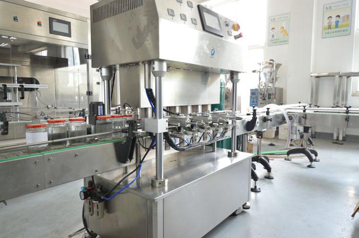 罐頭真空封蓋機(jī)用于調(diào)味品醬、水產(chǎn)罐頭、水果罐頭等采用目前環(huán)保的玻璃瓶包裝后對(duì)瓶?jī)?nèi)真空度有比較高要求的三旋、四旋蓋的玻璃瓶進(jìn)行封蓋,本機(jī)配上真空系統(tǒng)后,能先對(duì)玻璃瓶?jī)?nèi)進(jìn)行抽吸真空,然后再進(jìn)行旋蓋封口,以延長(zhǎng)瓶?jī)?nèi)容物的保質(zhì)期及增強(qiáng)口感,而且不用加熱以保持物料色澤不變。實(shí)行自動(dòng)進(jìn)瓶、自動(dòng)封蓋、自動(dòng)進(jìn)行抽真空。