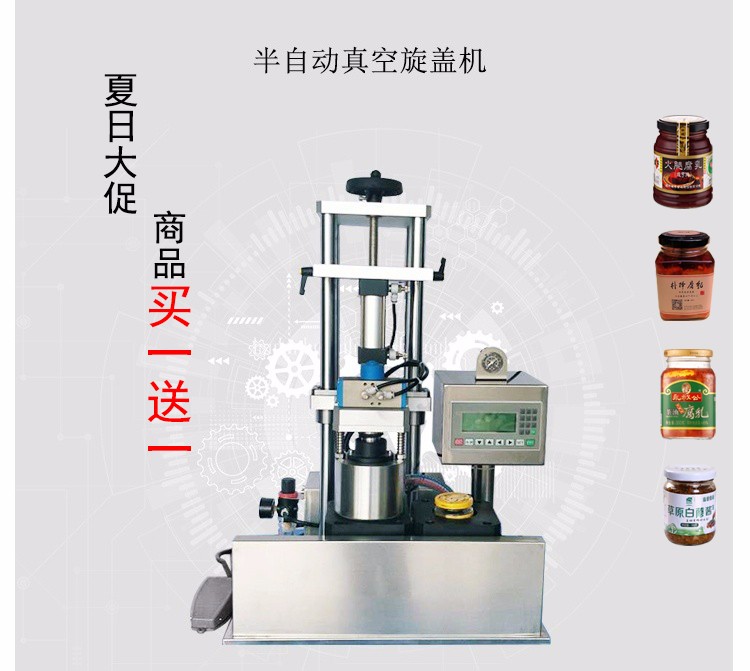 這款小型辣椒醬封口機(jī)主要用于食品包裝,采用標(biāo)準(zhǔn)馬口鐵爪式旋開蓋封口的玻璃瓶包裝??蓪崿F(xiàn)的功能是抽吸包裝容器內(nèi)的空氣使其達(dá)到設(shè)定的負(fù)壓值(即抽真空),然后旋緊蓋子。 為半自動機(jī)型,即人工進(jìn)出瓶,人工配蓋,其他過程自動。